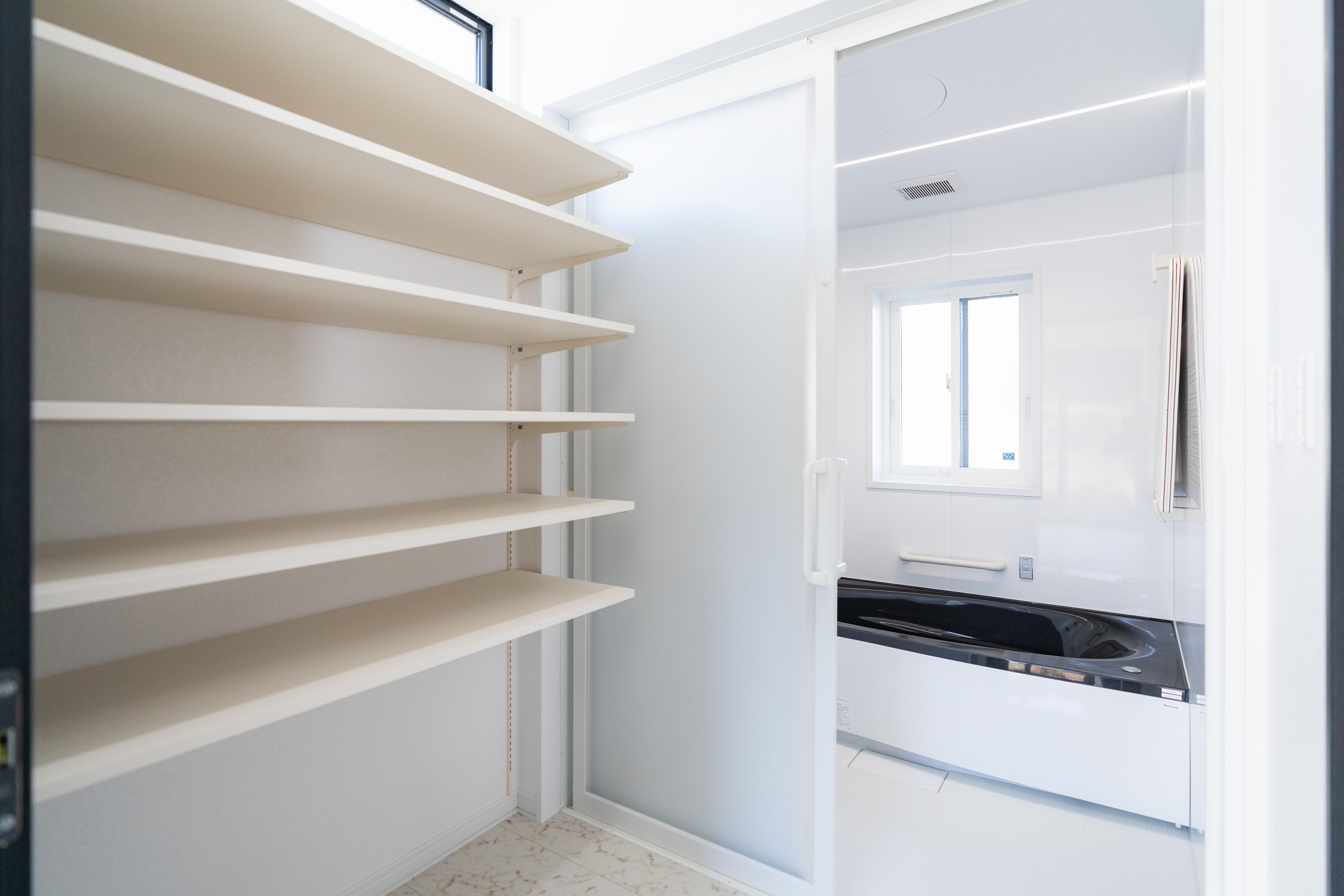 棚をたくさん設けタオル類、着替えなども家族分がしっかり整理整頓できますね