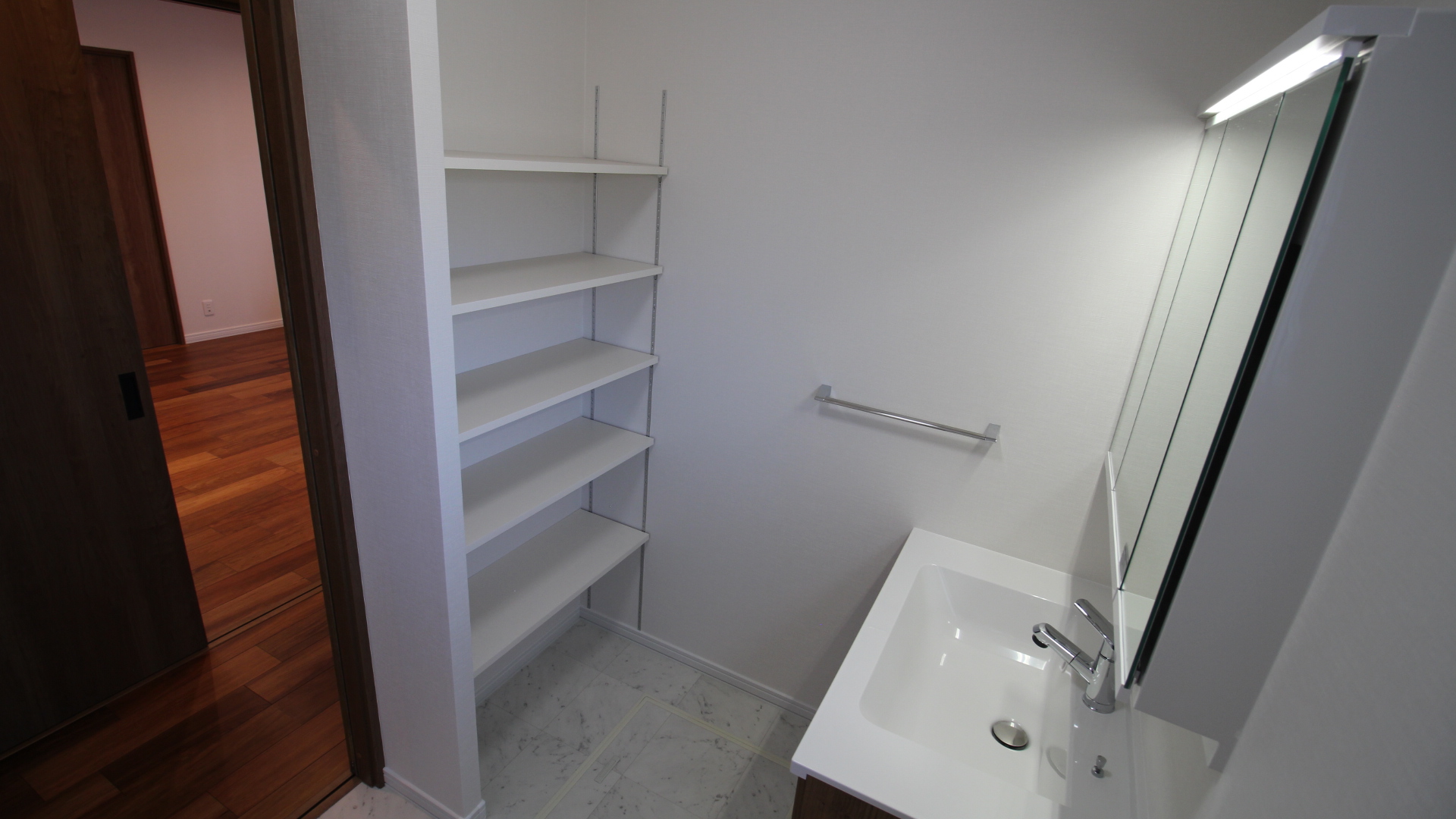 洗面室には可動棚を設置し、スッキリと収納できます。