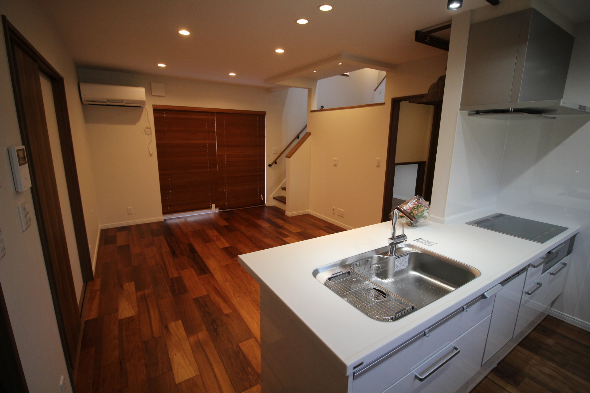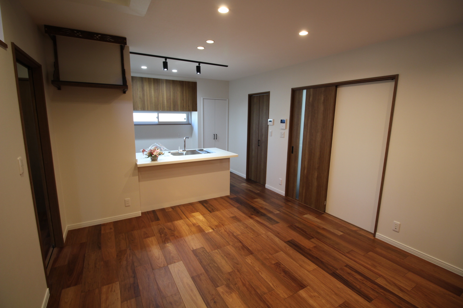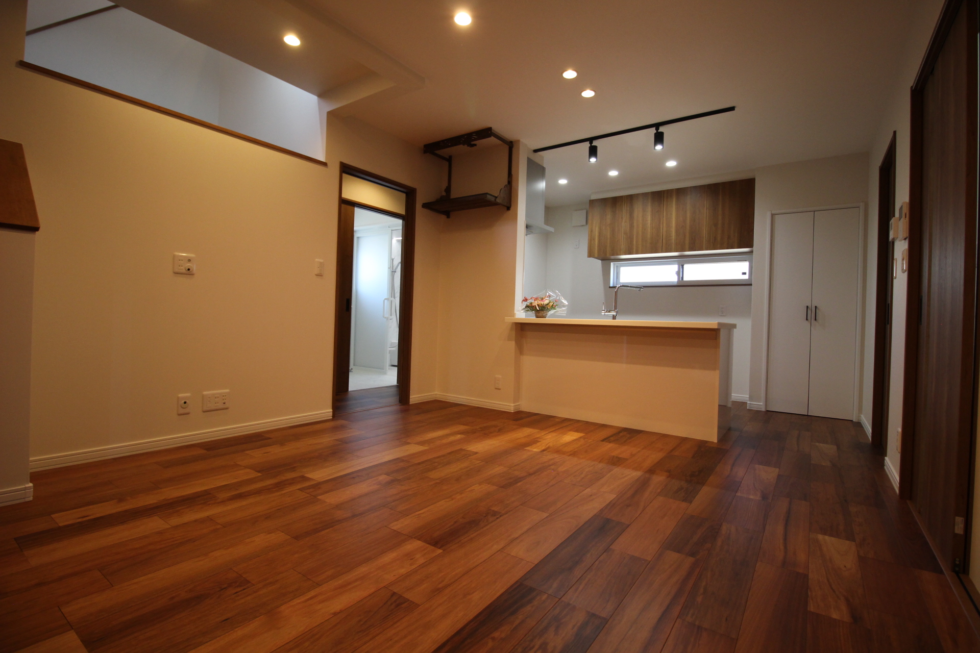 リビングはブラウンのカラーで統一し、ダウンライトや、ペンダントライトが灯る落ち着きのある空間が完成。