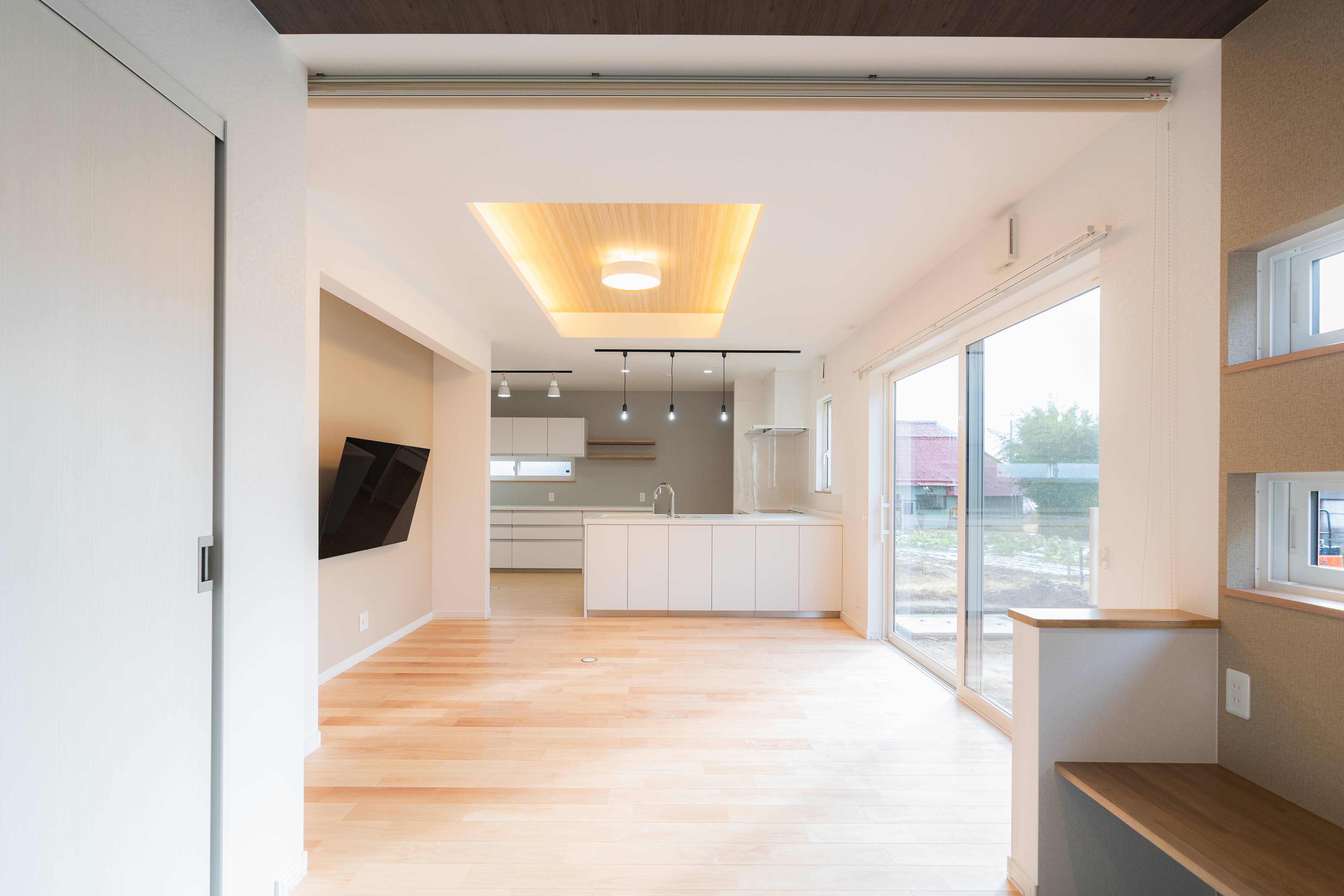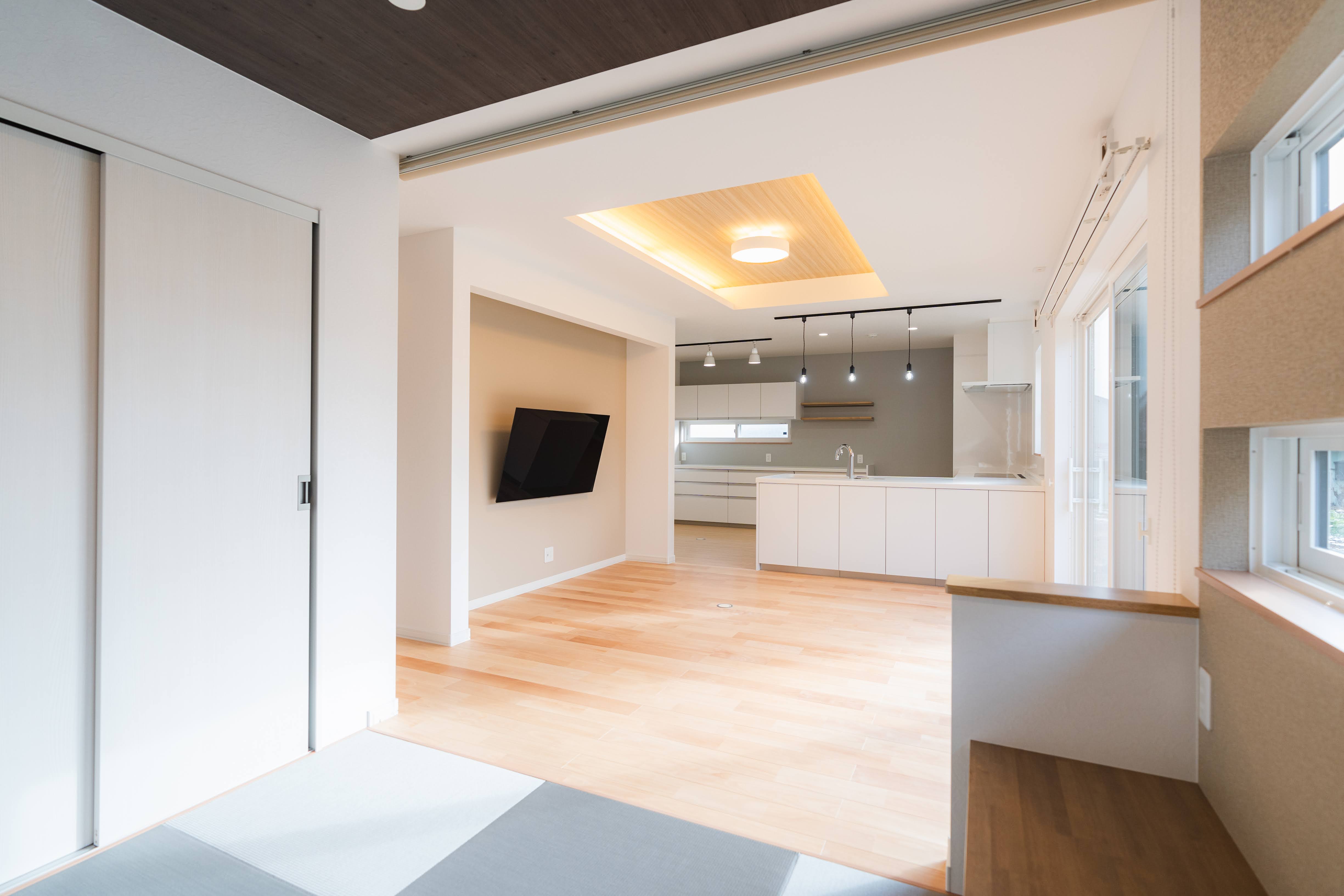 「スクリーンで楽しむ畳部屋とL型キッチンの家」