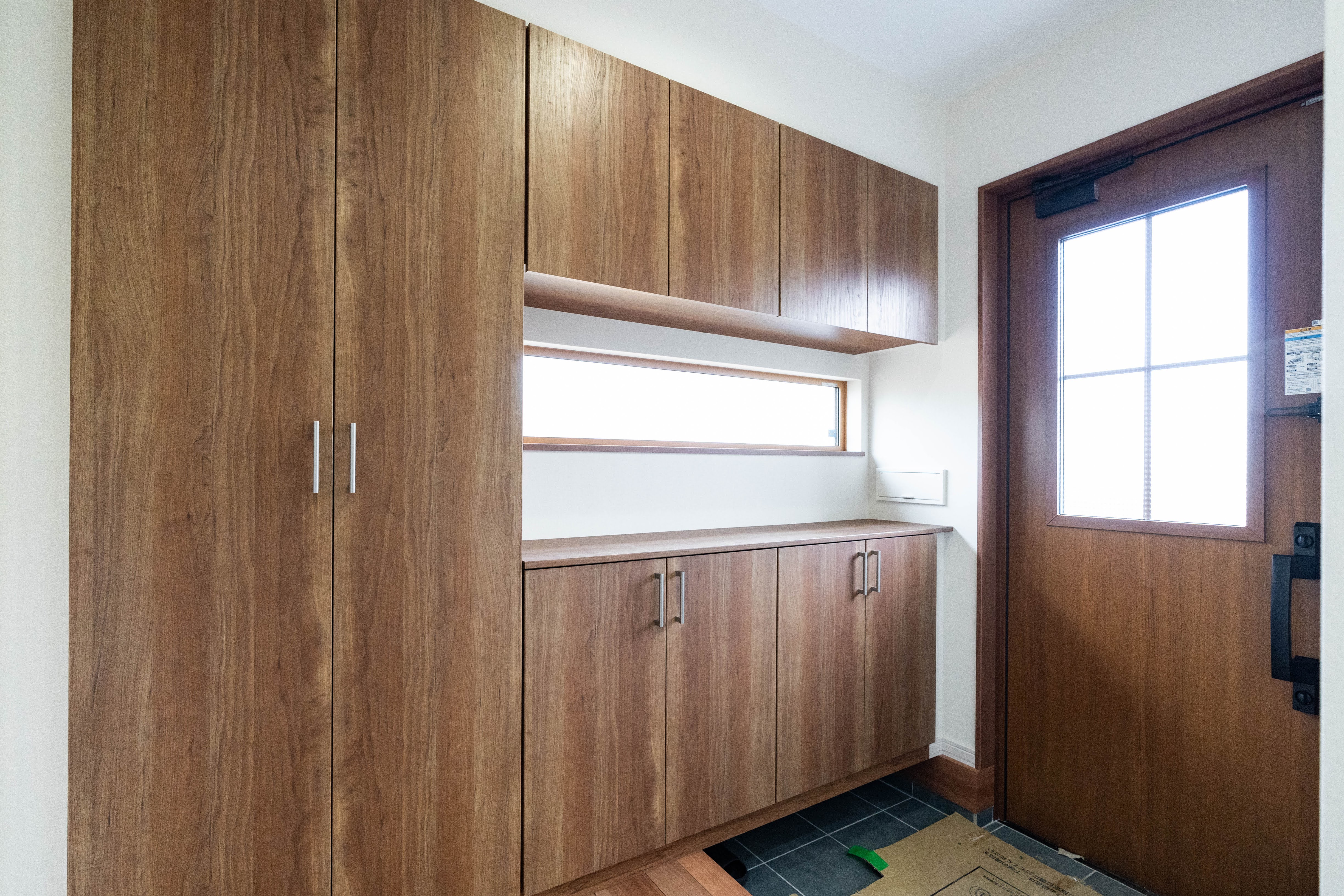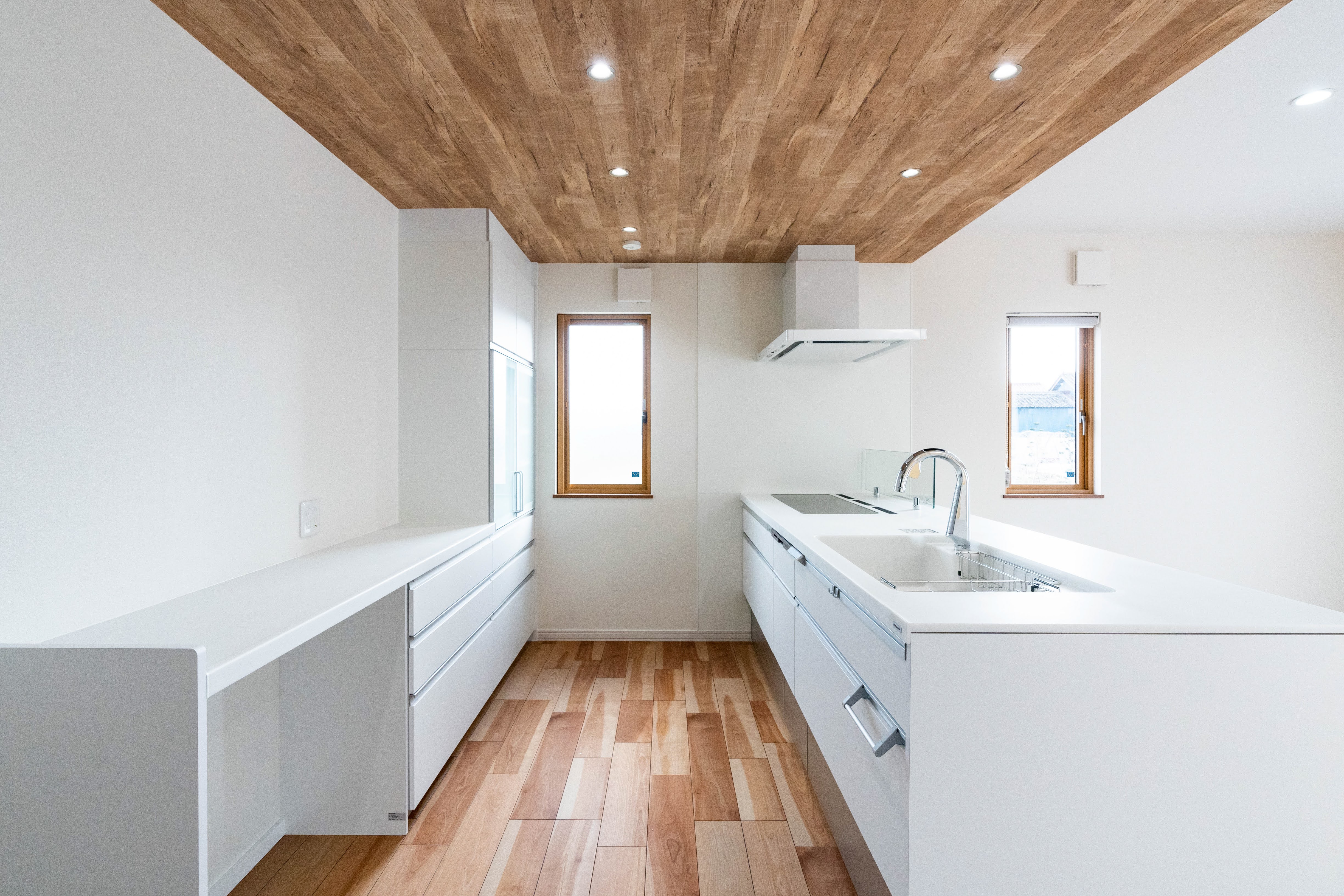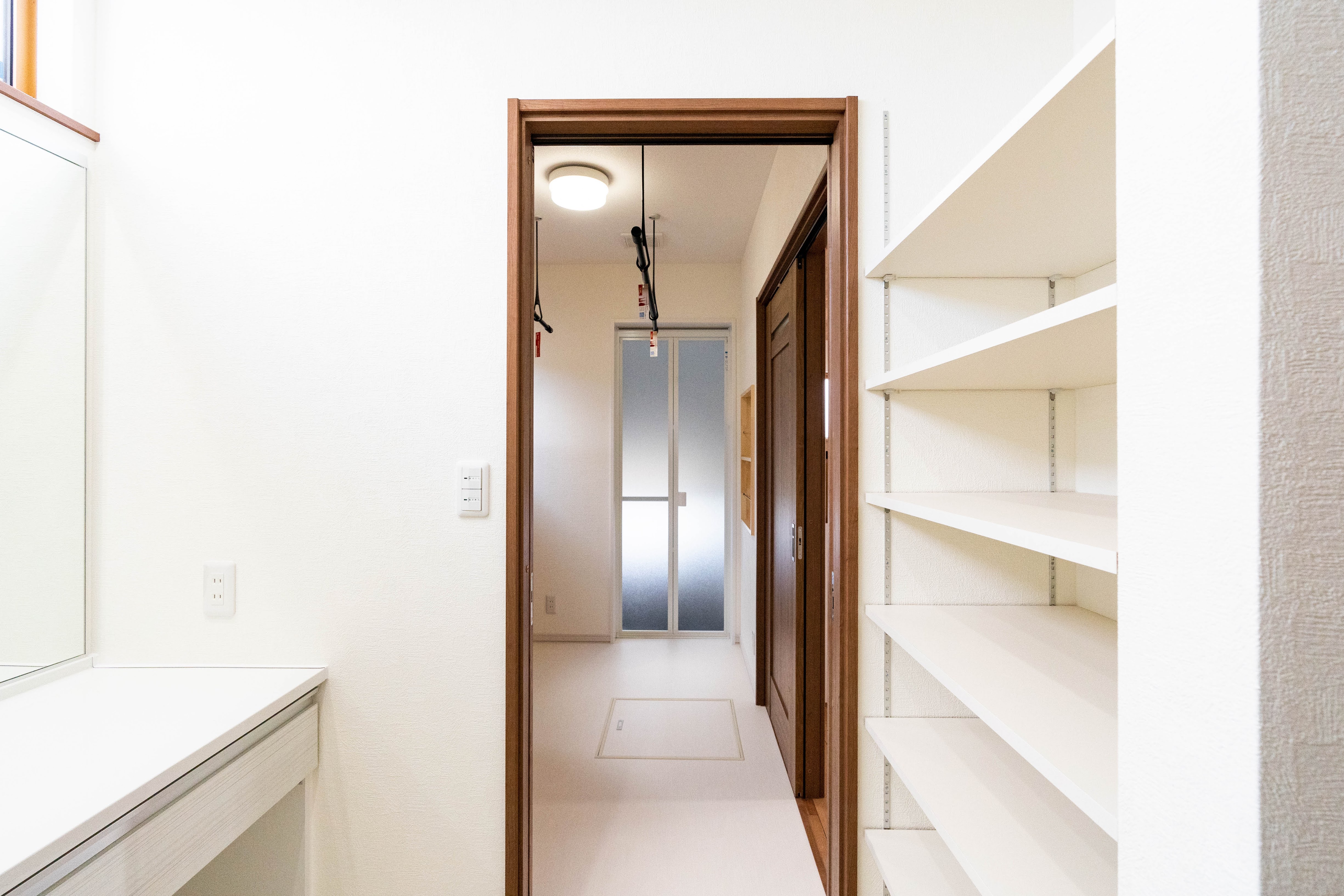 白が映えるシステムキッチン/充実のパントリー収納/リビングの続きの和室と庭/明るい洗面所とバスルーム/落ち着いた書斎でテレワーク対応