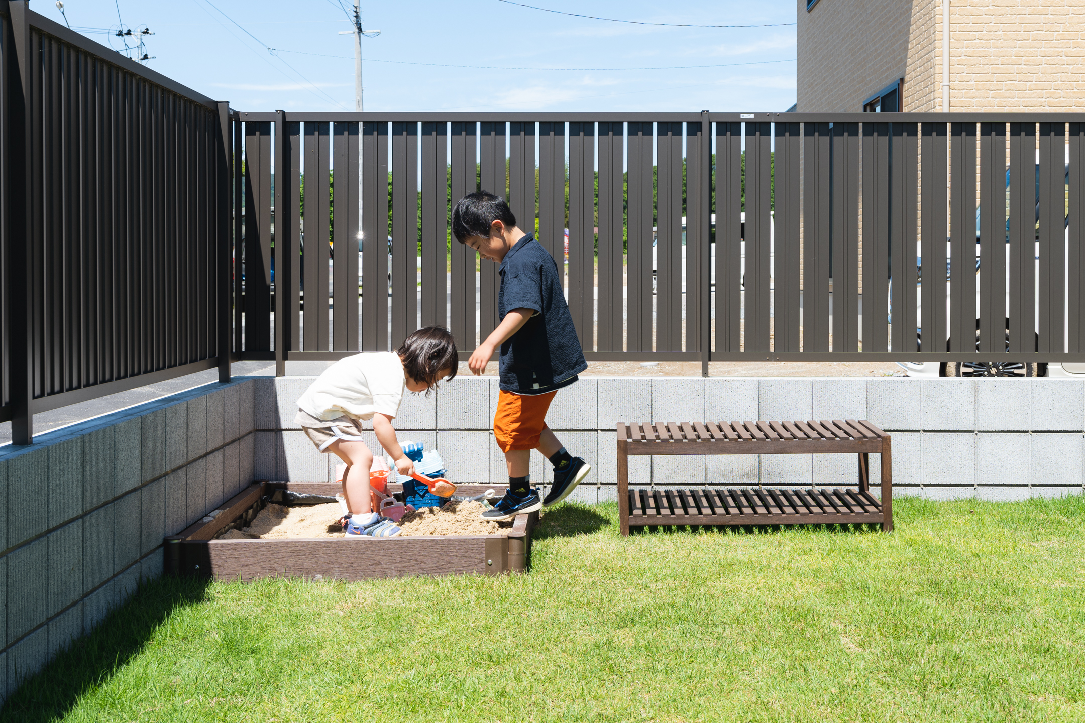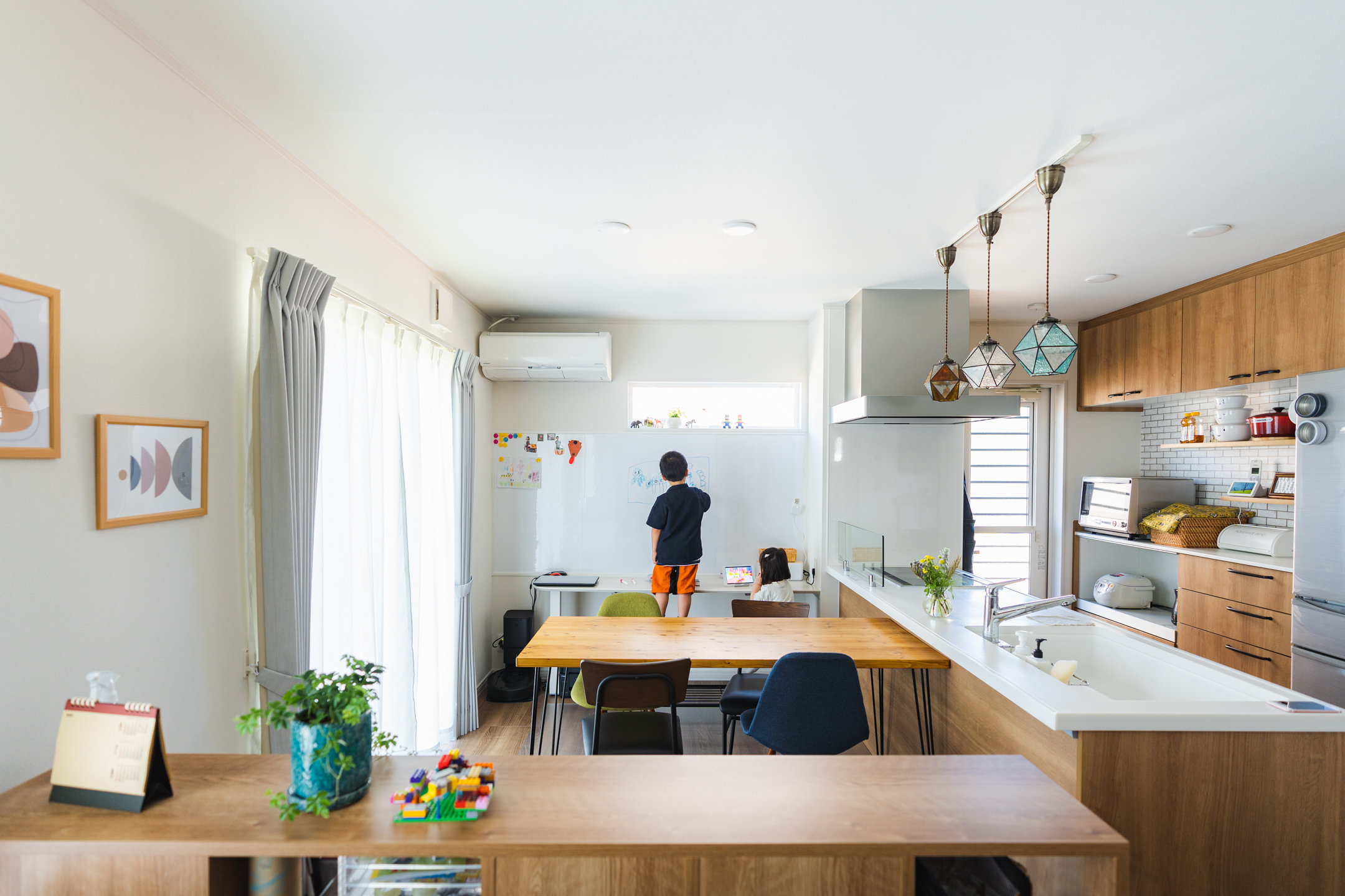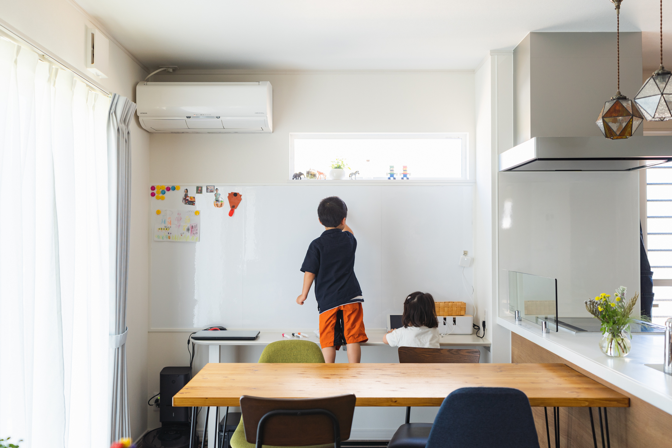 家族で楽しむお絵描きコーナー/仲良しきょうだいの遊び場/家事ラク調味料置き場/砂場付きの広い庭/おしゃれなアイアン物干し/和の趣ある和室