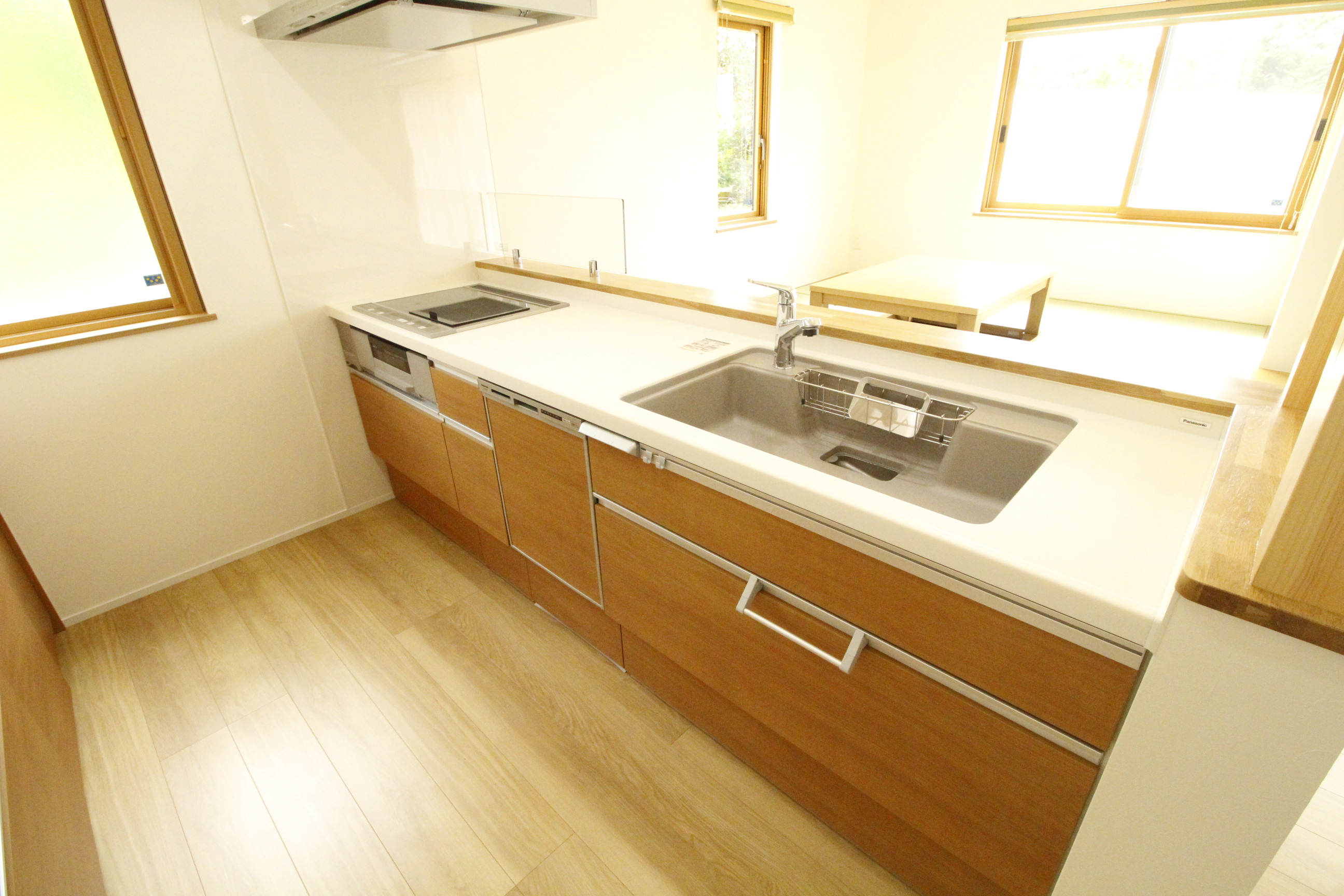 テーブルからキッチンをキッチンからテーブルを家族の姿が良く見えます。