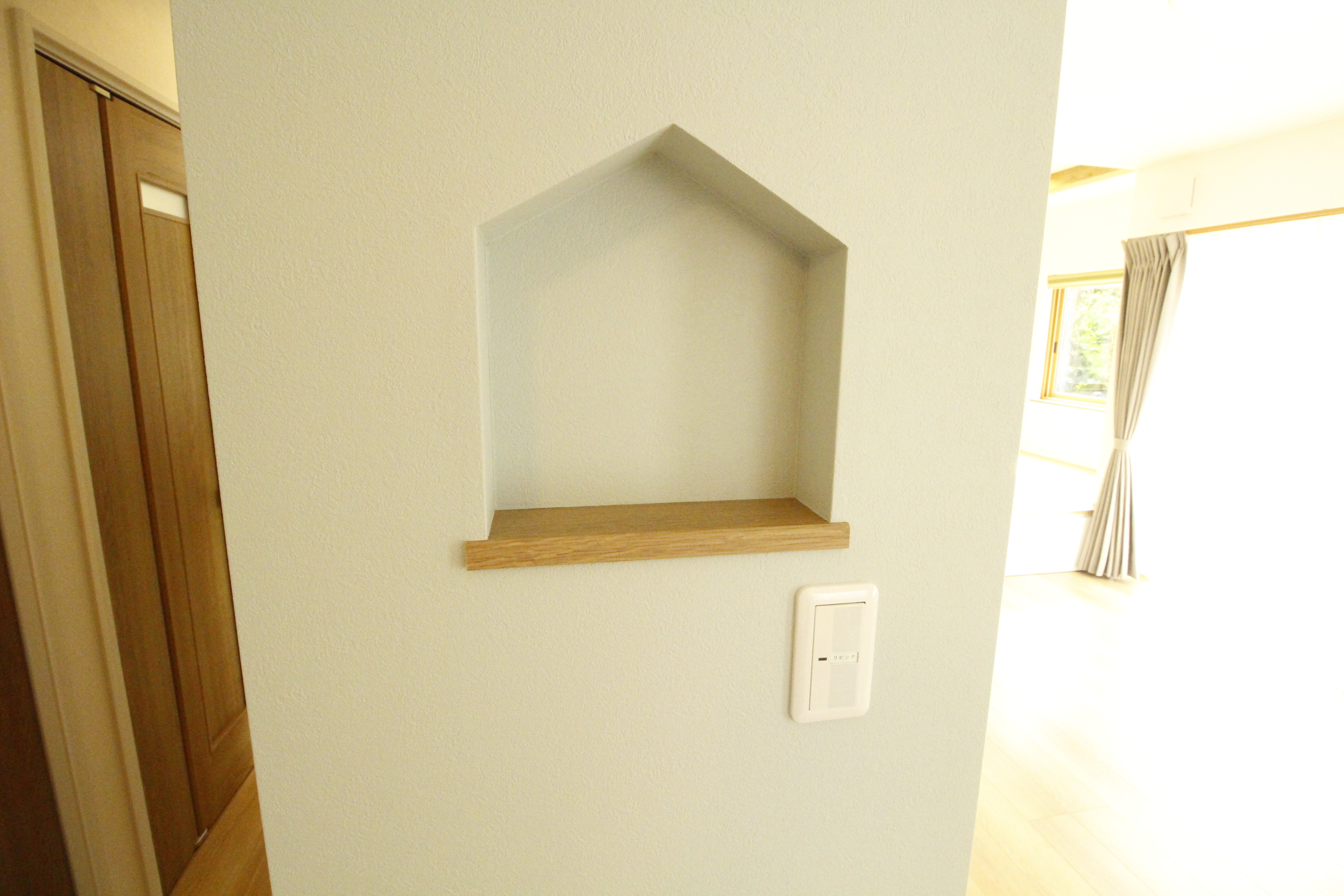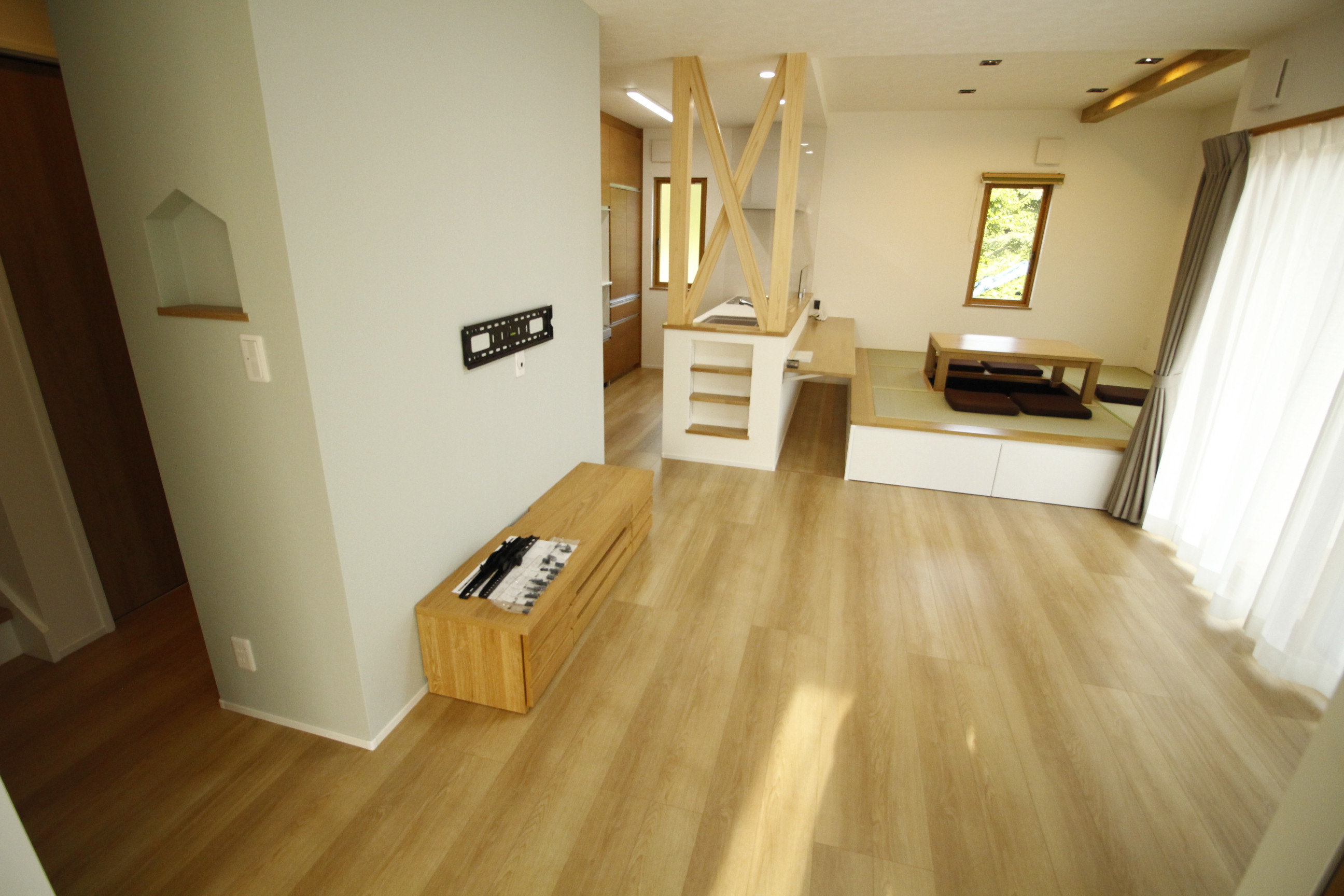カフェ風小上がり畳スペース/家族全員が見渡せるキッチン/たっぷり収納で片付けも簡単/おうち型のニッチと秘密基地/自然に囲まれた明るい暮らし