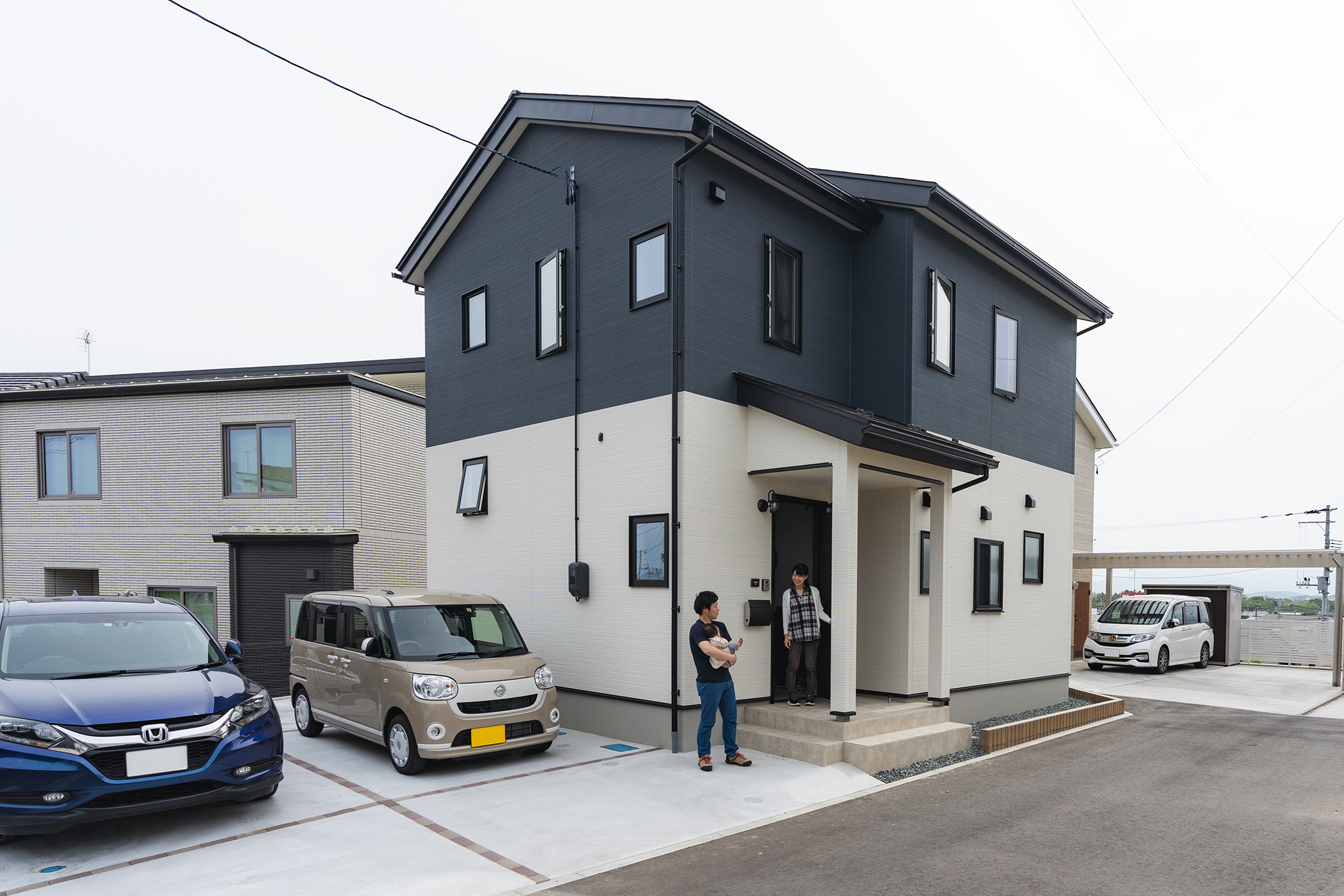 玄関に洗面台で手洗いラクラク/キッチン直結のダイニングテーブル/広いリビングで子供の安心見守り/2色おしゃれのスタイリッシュな外観/家族が集まる快適空間