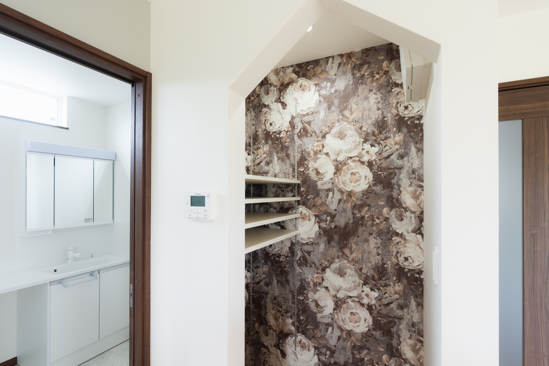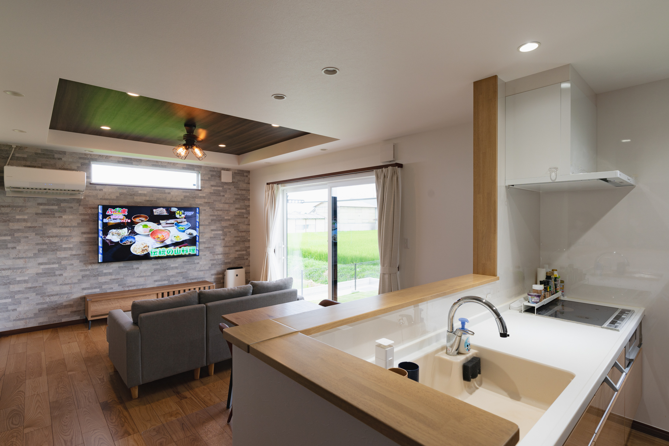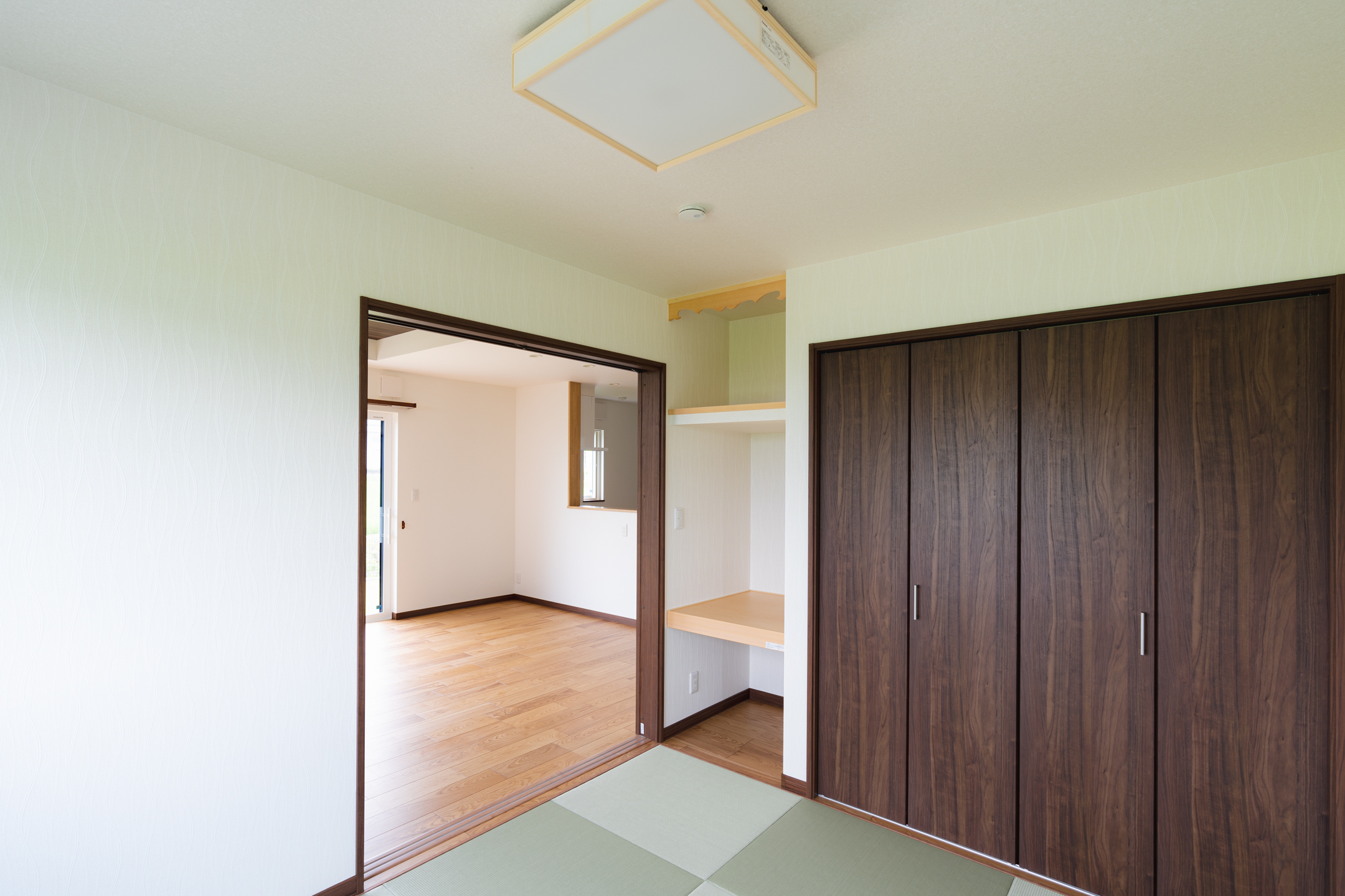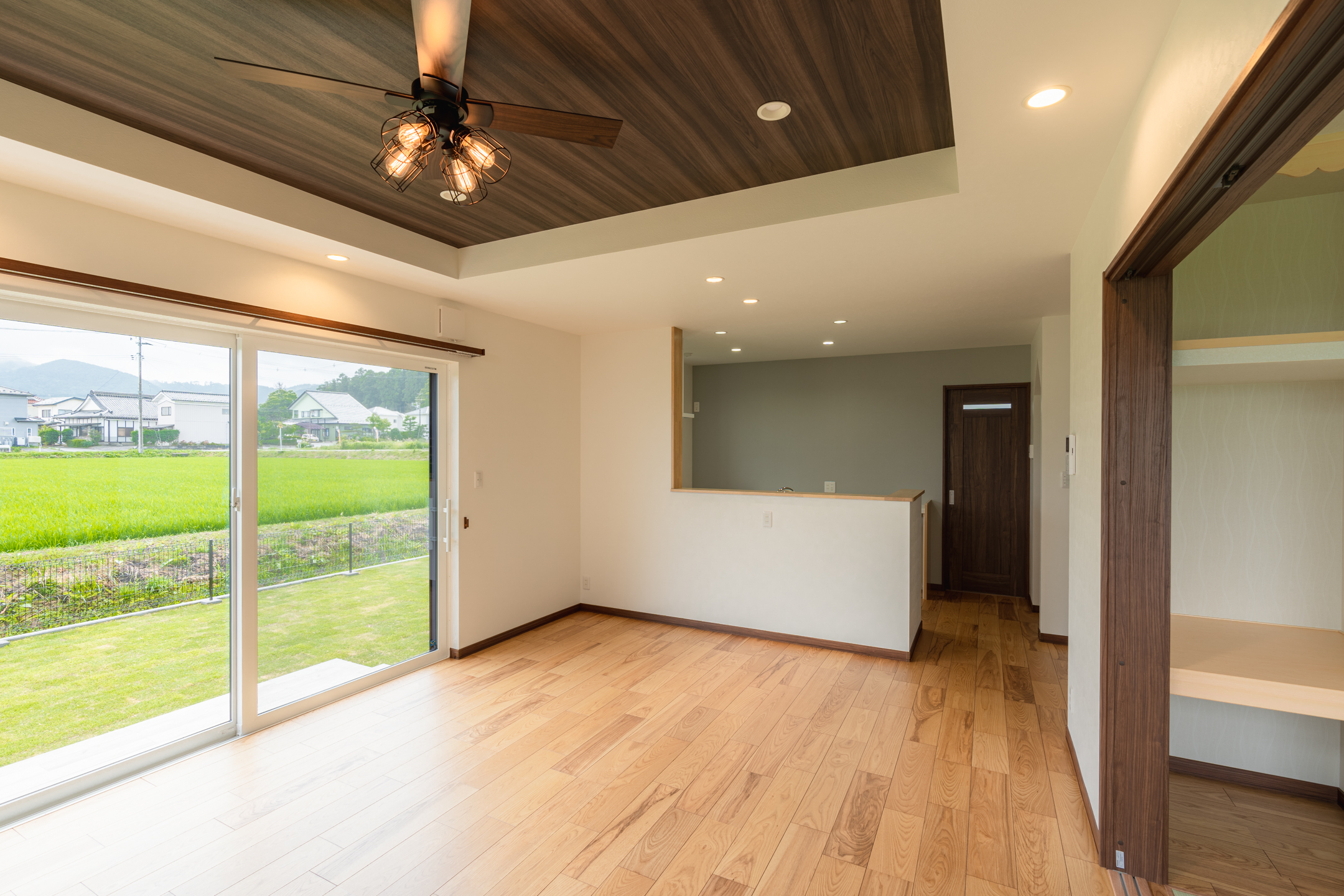 シックな天井で落ち着いた空間/和室とリビングの快適なつながり/プライバシーを守る北側窓/収納充実でお片付けラクラク/パントリーも楽しめる空間/庭と芝生で自然を満喫