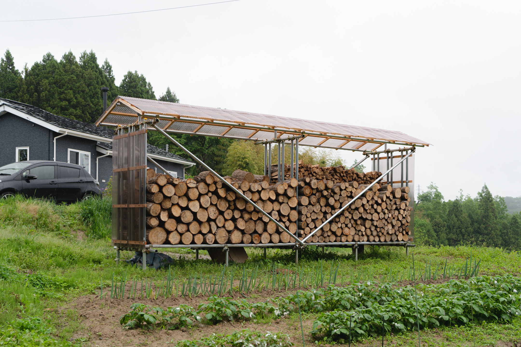 外には薪ストーブ用の薪置き場が。