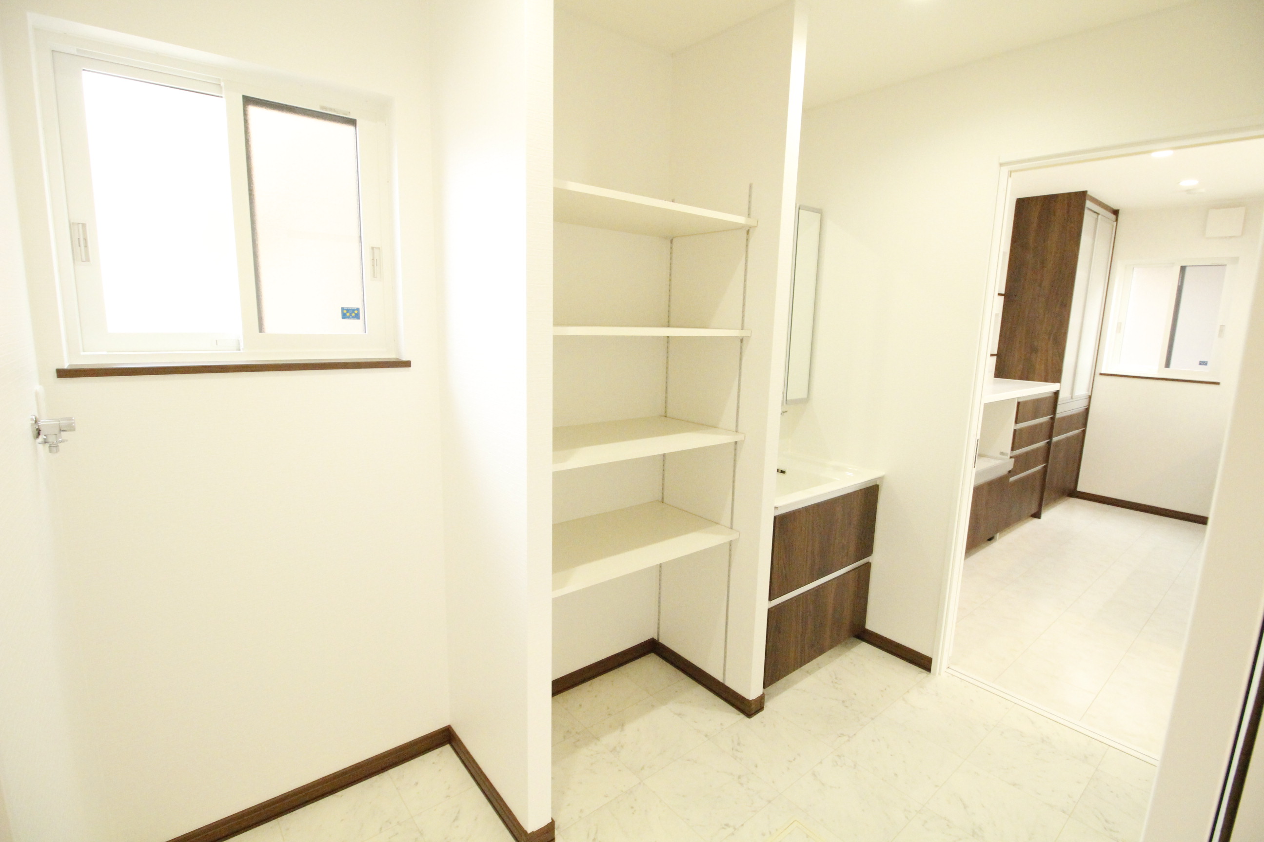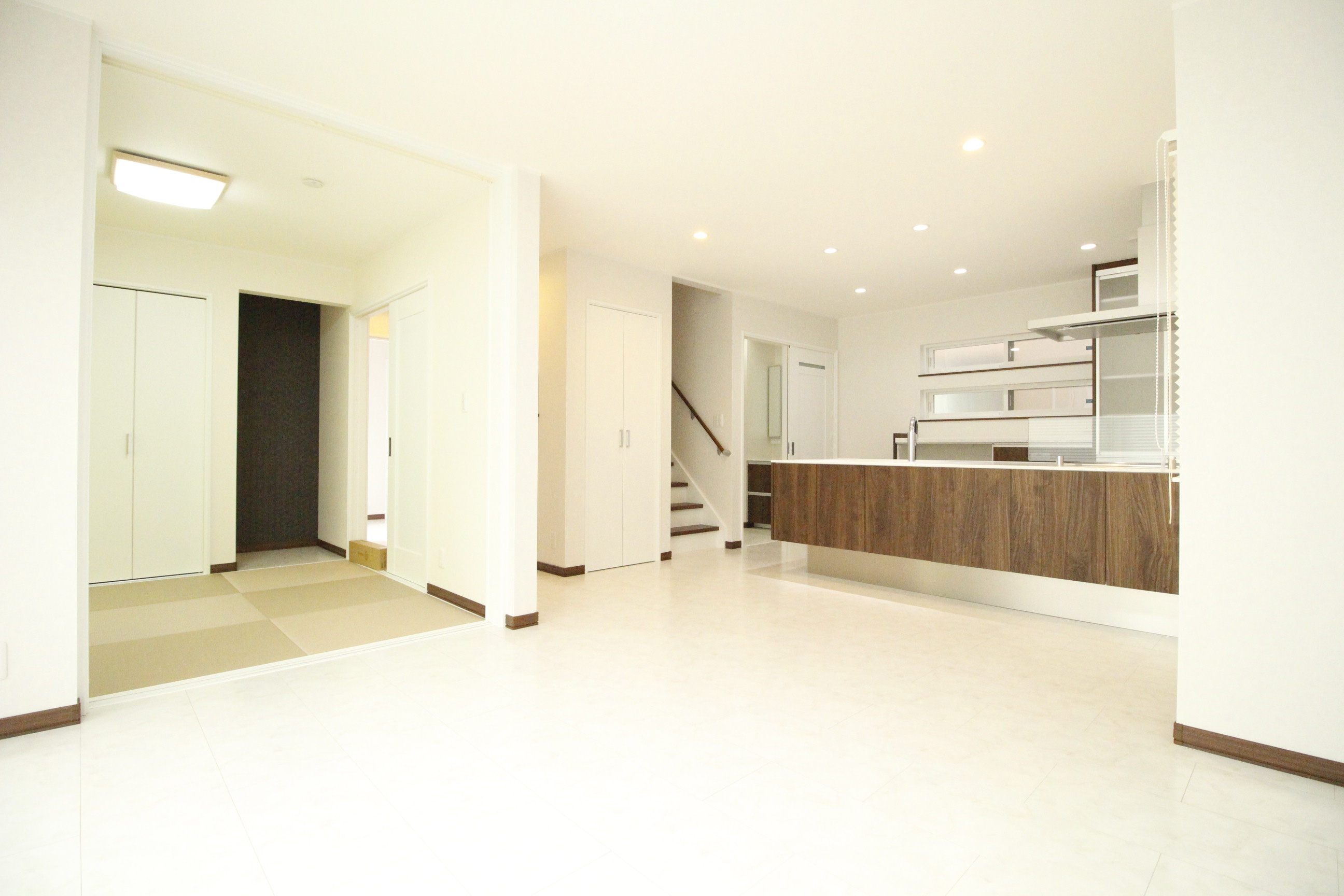広い遊び場と壁付けテレビで快適リビング/和室は2つの出入り口で使いやすさ抜群/一直線のDKから洗面所への導線/室内物干しホシ姫サマでスッキリ収納/お子様の成長を見守る家事ラク設計
