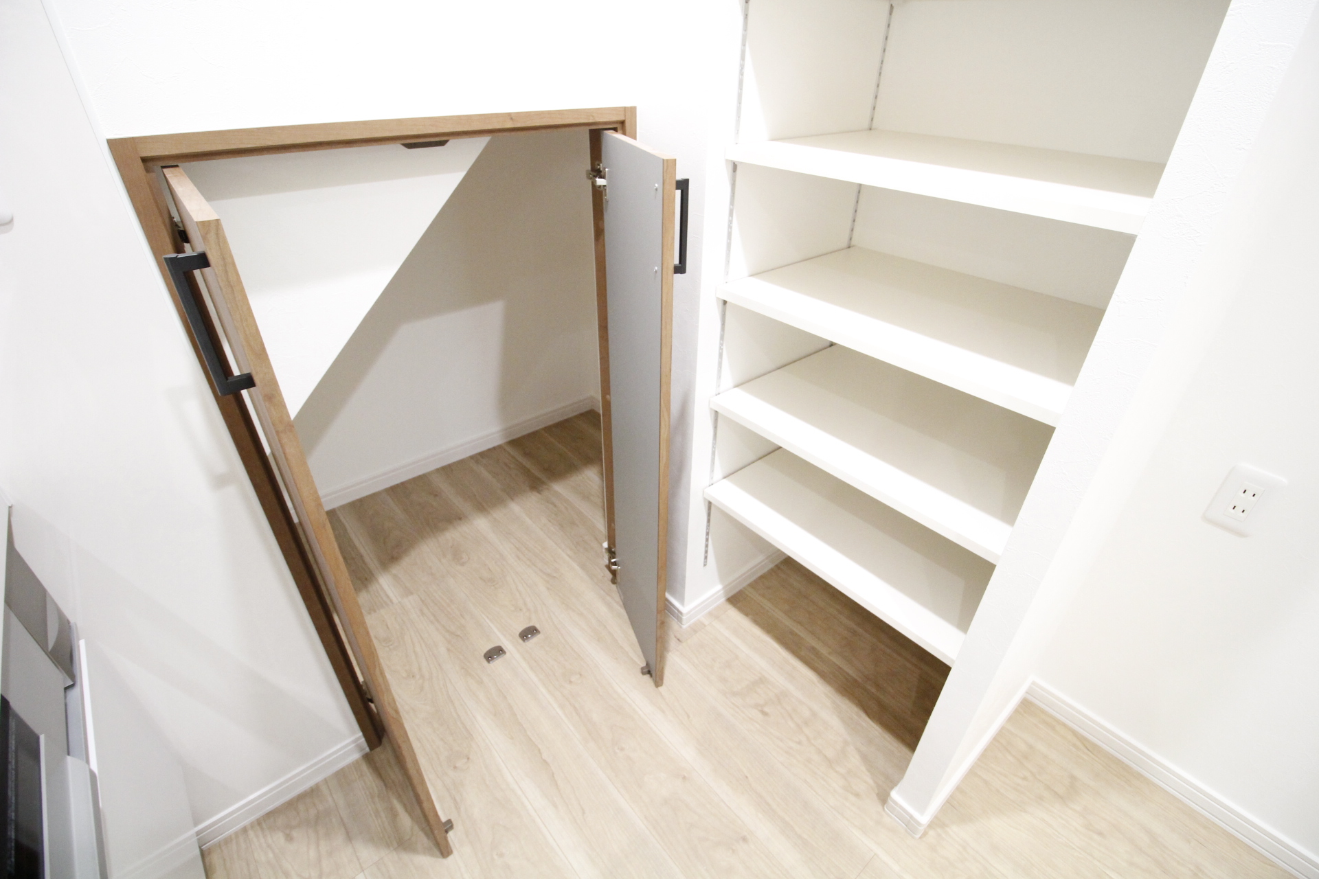パントリーとその奥には階段下収納