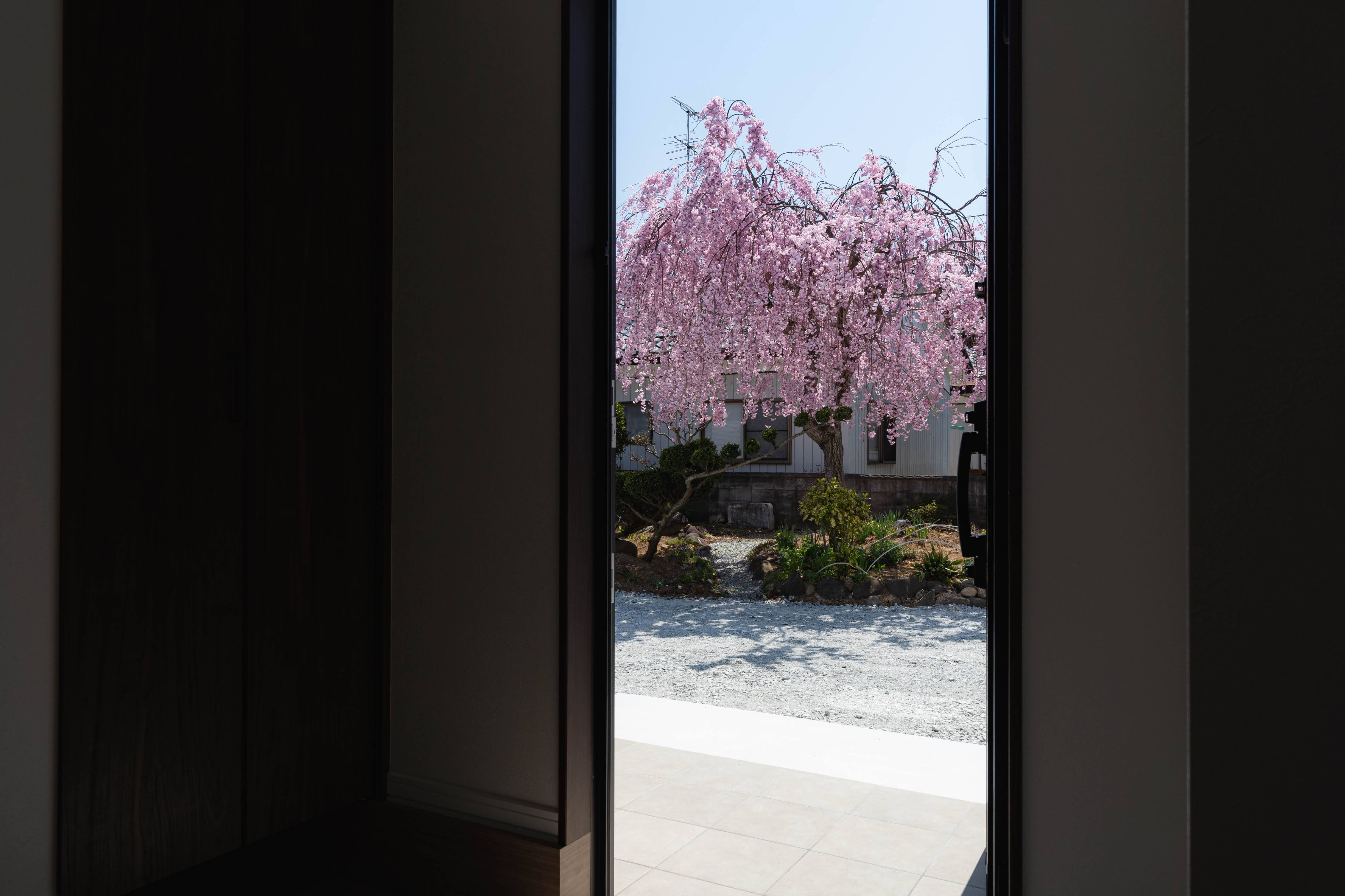 中二階のプライベートスペース/桜を愛する贅沢なロケーション/玄関の靴収納はすっきり整理/大きな窓で明るい清潔なキッチン/家族で楽しむ季節の庭